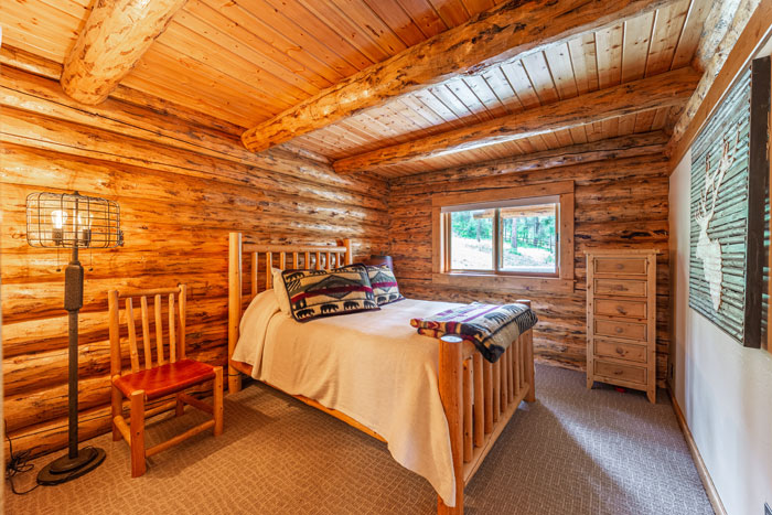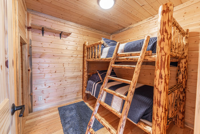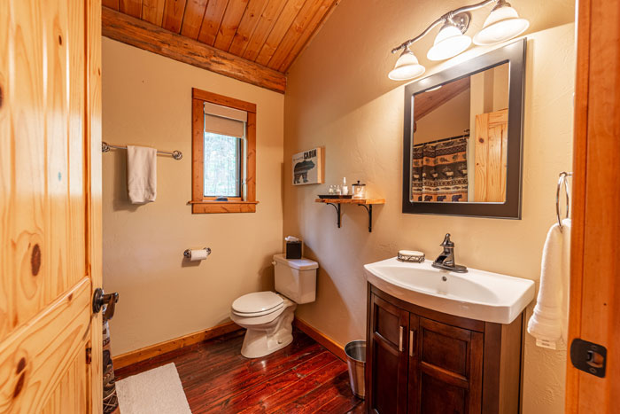 The Doll House cabin offers a fun Western feel with beautiful lake and mountain views. The cabin has two bedrooms, one with a queen bed and the other with single bunk beds, as well as a sleeper sofa in the living room. The cabin is equipped with air conditioning and accommodates up to six guests.