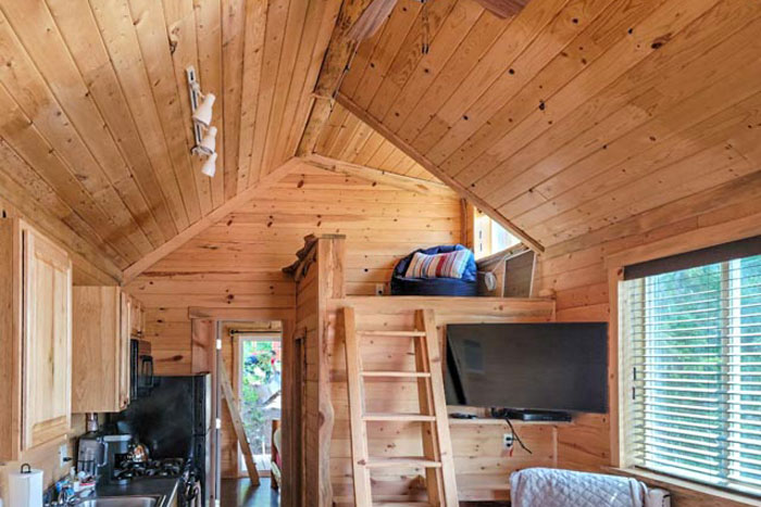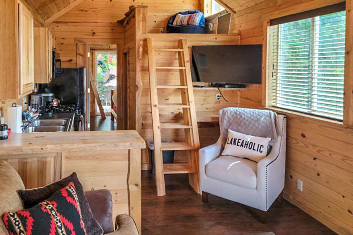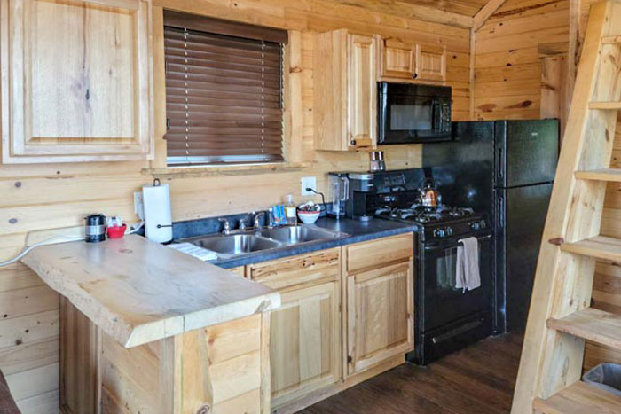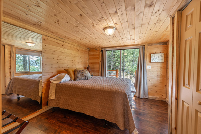 The Tree House cabin is a luxurious one-bedroom suite with a king bed and a queen Murphy bed. The cabin has a spacious bathroom, large closets, high ceilings, and stunning lake views from the balcony. Equipped with air conditioning, the cabin has a full kitchen and accommodates up to four guests. The Tree House cabin is perfect for a romantic getaway or a small family vacation.