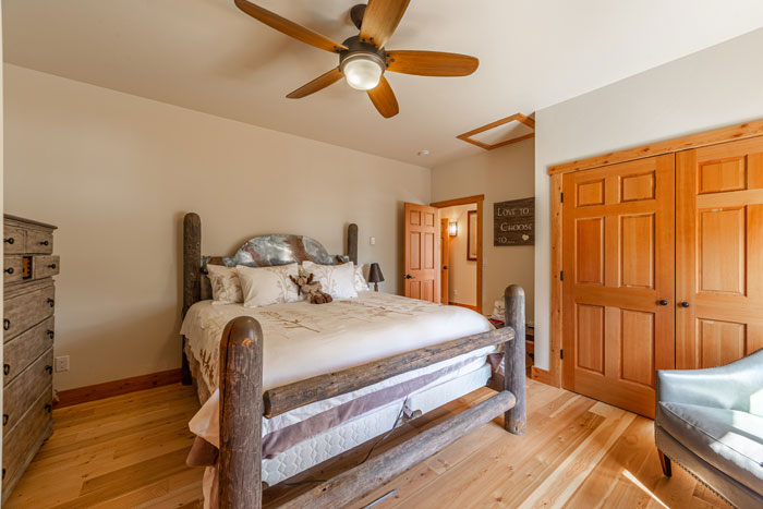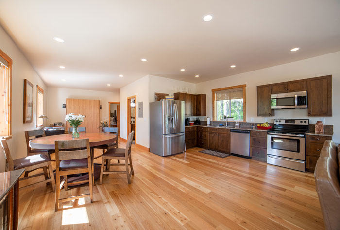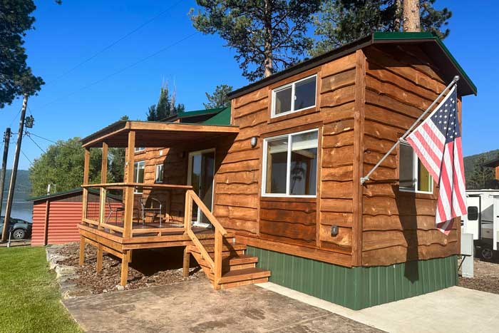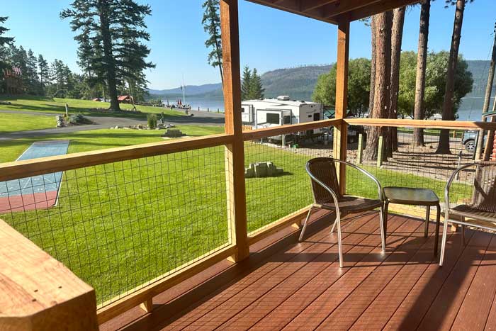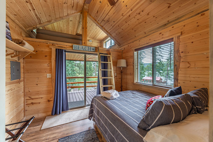 The Huckleberry House cabin at The Lodge & Resort at Lake Mary Ronan is a charming new cabin with a one-bedroom that has a queen bed and two sleeping lofts for kids or young adults. The lofts have two twin beds and a full bed, and the living room has an additional pull-out couch. The cabin has a front deck with sweeping views of the lake and a patio with a picnic table. The cabin has a full kitchen and grill on the deck. The Huckleberry House cabin sleeps up to six guests.