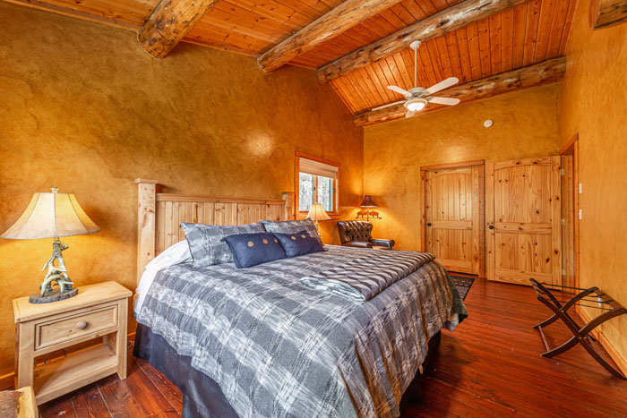 The Eagle’s Nest is a charming one-bedroom suite with a king bed, sleeper sofa in the living room with a fireplace, and a large loft with large cots. The cabin has a luxurious bath with a walk-in shower and panoramic views of the lake and mountains. The cabin accommodates up to four guests and is equipped with air conditioning, a coffeemaker, and a microwave.